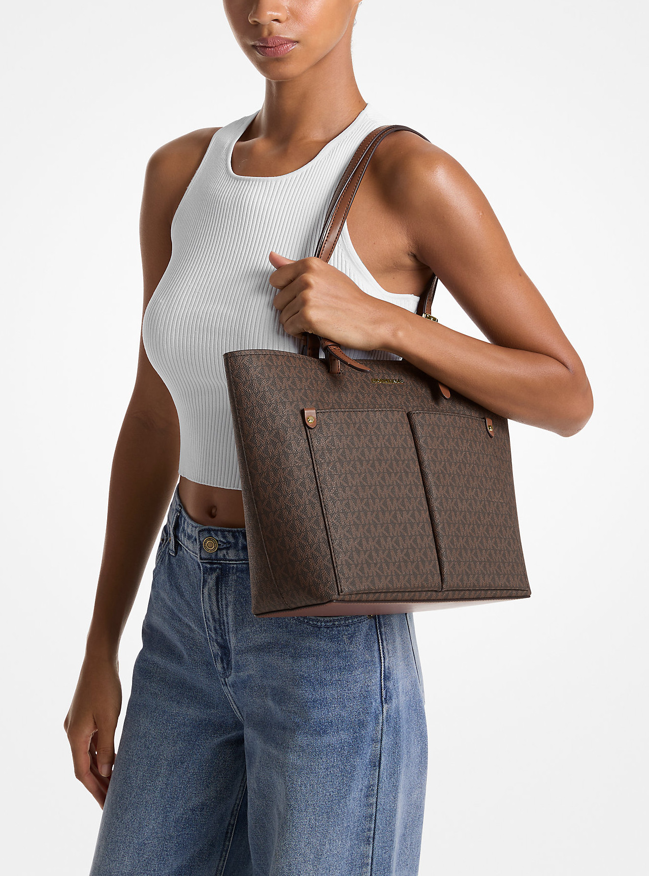 Michael Kors Kabelka Jet Set Medium Logo Pocket Tote Bag Brown